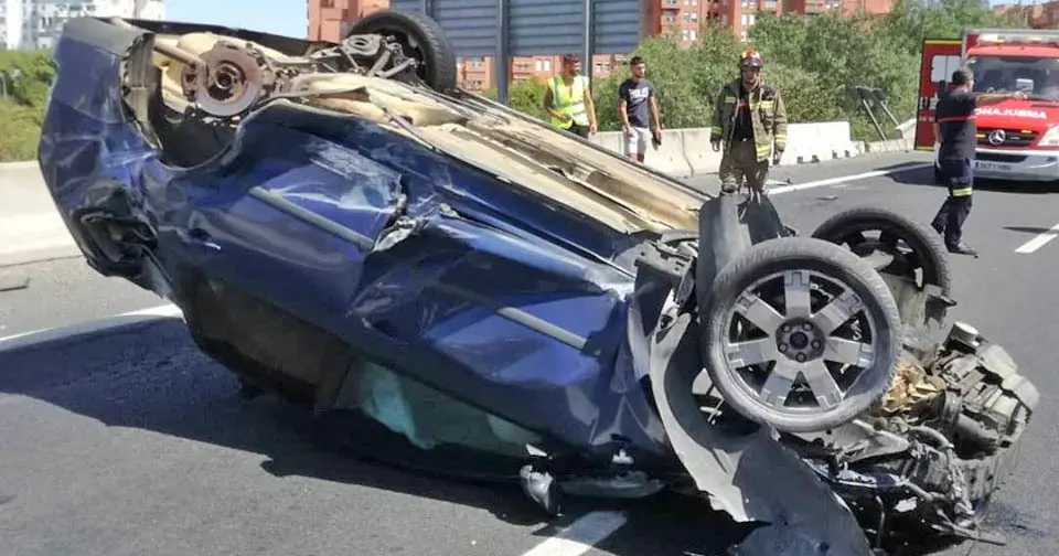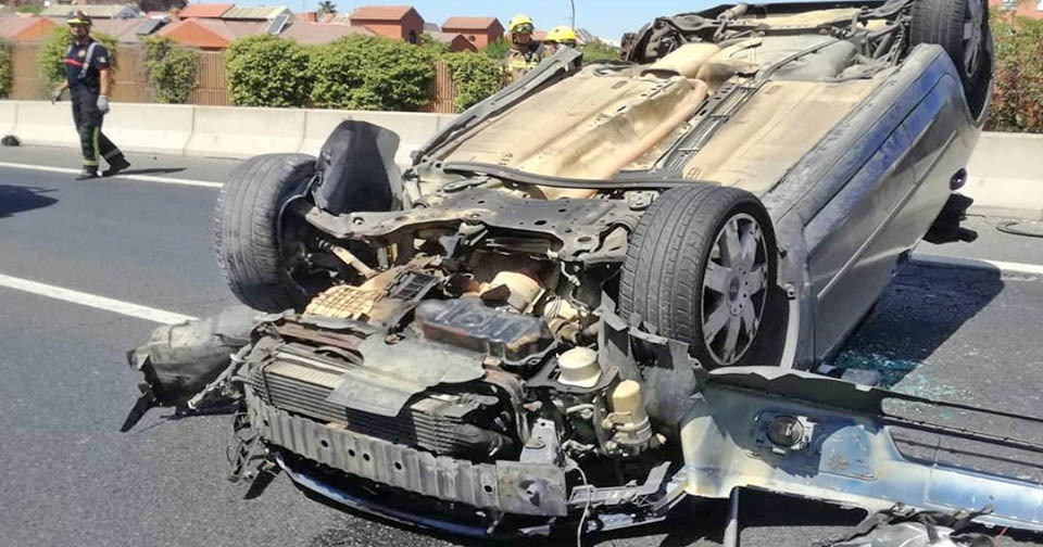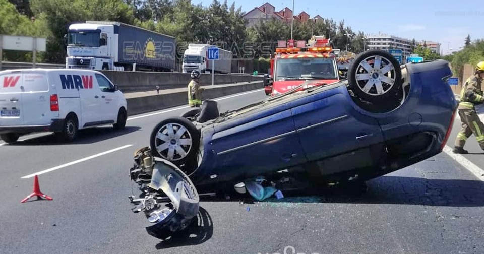 Un conductor de 30 ha resultado herido tras perder el control de su vehículo, chocar y acabar volcando en plena vía. El vehículo ha quedado totalmente destrozado.