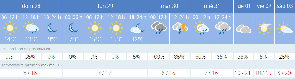 La Agencia Estatal de Meteorología, en su previsión de la semana, advierte de una bajada brusca de las temperaturas en Sevilla, llegando el domingo a unas mínimas de 8 grados, con leve previsión de precipitaciones para primera hora de la tarde, y unas máximas de 16, situación que se agudizará el lunes, con la mínima de la semana, llegando a 7 grados centígrados, situación que se repetirá el miércoles, añadido a las lluvias y tormentas reaparecerán desde el martes.