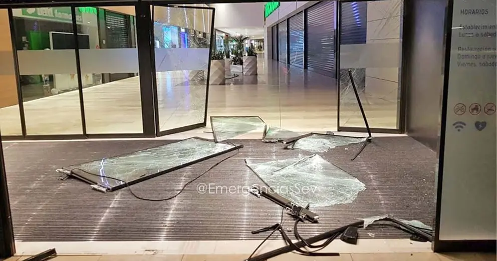 Agentes de este Cuerpo pudieron localizar a estos vehículos cuando se aproximaban a los aparcamientos del Centro Comercial Lagoh y como dos de estos vehículos embisten las cristaleras del establecimiento quedando uno de ellos fuera.