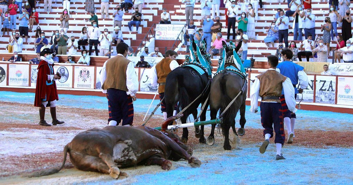 Sanlúcar de Barrameda (Cádiz), sábado, 22 de agosto de 2020. II Corrida Magallánica, organizada por Carmelo García en celebración del Quinto Centenario de la Primera Vuelta al Mundo. Tarde soleada con algo de brisa. Un tercio de entrada, máximo aforo permitido por las restricciones causadas por el coronavirus, guardándose la distancia de metro y medio entre los espectadores, todos con mascarillas. Ameniza la Banda de Música “Julián Cerdán”, dirigida por Justo Jiménez.