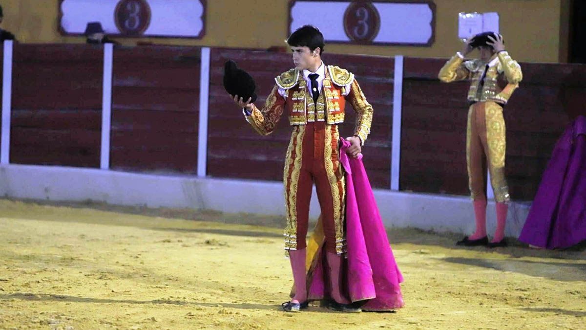 Francisco Delgado (de la escuela Rafael Ortega de San Fernando) recibe a su novillo, cómodo de cara y que flojea de manos, también en los medios aunque no sale un saludo muy limpio. Juan Rojas pone un buen par. Con la muleta baja la mano cada vez que la coge con la derecha; con la izquierda impulsa al animal, que sigue perdiendo las manos, dándole toquecitos con la ayuda (detalle impropio de un alumno de escuela); acaba recurriendo a los circulares y un fandango suena desde el tendido cuando no viene a cuento.