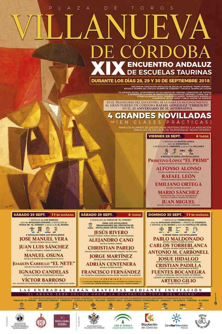 La composición de los carteles queda como sigue. Viernes, 28 de septiembre: novillos de Martín-Lorca, Espartaco, Osborne y Millares para Primitivo López "El Primi" (Escuela de Tauromaquia de Sevilla), Alfonso Alonso (Escuela de Tauromaquia de Camas), Rafael León (Escuela Taurina Diputación de Málaga), Emiliano Ortega (Escuela Taurina de Lucena), Mario Sánchez (Escuela Taurina de Ubrique) y Juan Miguel (Escuela Taurina Campo de Gibraltar). Sábado 29, por la mañana: novillos de Los Rodeos, Apolinar Soriano, Toros de El Torero y El Rodeo para José Manuel Vera (Escuela Taurina de Sevilla-Amate), Juan Luis Sánchez (Escuela Taurina de Ubrique), Manuel Osuna (Escuela de Tauromaquia de Écija), Joaquín Carrillo “El Nete” (Escuela de Tauromaquia de Jaén), Ignacio Candelas (jerezano pero de la Escuela de Tauromaquia de Ronda) y Víctor Barroso (Escuela de Tauromaquia “La Gallosina”). Sábado 29, por la tarde: novillos de El Torero para los triunfadores del proyecto de novilladas sin picadores de Canal Sur: Jesús Rivero (Escuela Taurina de San Fernando), Alejandro Cano (Escuela Taurina Linense), Christian Parejo (Escuela Taurina de Chiclana), Jorge Martínez (Escuela Taurina de Almería), Adrián Centenera (Escuela Taurina de Baza) y Francisco Fernández (Escuela de Tauromaquia de Algeciras). En este festejo el triunfador ganará un traje de luces y el segundo clasificado recibirá un capote de paseo. Domingo 30: reses de Torrestrella, Apolinar Soriano, Chamaco, El Rodeo y Castillo de Azuel para Pablo Maldonado (Escuela Taurina de Motril), Carlos Torreblanca (Escuela Taurina de Atarfe), Antonio M. Carbonell (Escuela de Tauromaquia de La Algaba), Josué Hidalgo (Escuela Taurina de Córdoba), Cristian Padilla (Escuela de Tauromaquia de Baeza), Fuentes Bocanegra (Escuela Taurina de Córdoba) y Arturo Gilio (Escuela Taurina de Lucena). Durante el certamen se rendirá homenaje al torero cordobés Rafael González "Chiquilín", con motivo de sus 25 años de alternativa, y se podrá visitar una exposición de fotografía sobre su trayectoria en la oficina de turismo de la localidad. Además, el sábado, a las 21:00 horas habrá una mesa redonda sobre “La tauromaquia de Chiquilín”. Completarán el calendario tres convivencias entre los directivos de las escuelas.