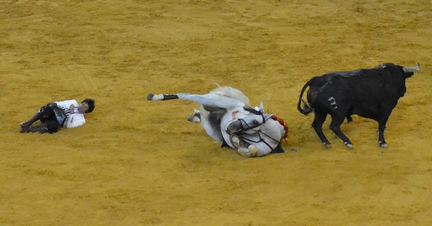 Andrés Romero, en su primero, suelto de salida, paró con Monte realizando una preparación laboriosa para dejar un rejón fácil arriba y, ante el segundo rejón, el toro rehúye la pelea y salta al callejón; da la vuelta completa al anillo porque no hay nadie que abra una puerta a mitad de recorrido; al volver a la arena sigue huidizo y el rejoneador renuncia a ese segundo hierro. Sobre Caimán pone una al cuarteo y, a la segunda, el caballo tropieza en la arena y el jinete es lanzado hacia adelante para luego recibir encima a la cabalgadura en una vuelta de campana; quedó tendido inmóvil y es llevado a la enfermería en un ambiente que casi entrevió la tragedia.