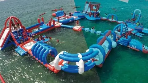 Un parque acuático en pleno mar en El Puerto de Santa María 6/6/18 La playa de Las Redes acoge este parque en pleno mar