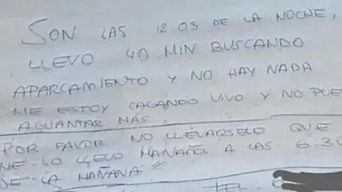 Deja una nota en su coche para que no le multen: "Me estoy cagando vivo" El MIRA 22/11/19 El joven, que llevaba casi una hora intentando aparcar, dejó una nota avisando que quitaría pronto el coche