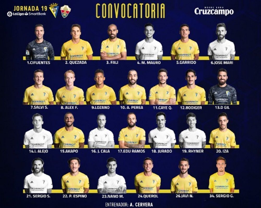 Este sábado la primera plantilla cadista ha realizado la última sesión preparatoria para el encuentro de la jornada 19 ante el Elche Club de Fútbol, que se disputará este domingo a las 21:00 horas en el estadio Ramón de Carranza. El entrenador Álvaro Cervera daba a conocer la siguiente lista de 18 futbolistas convocados para el partido: