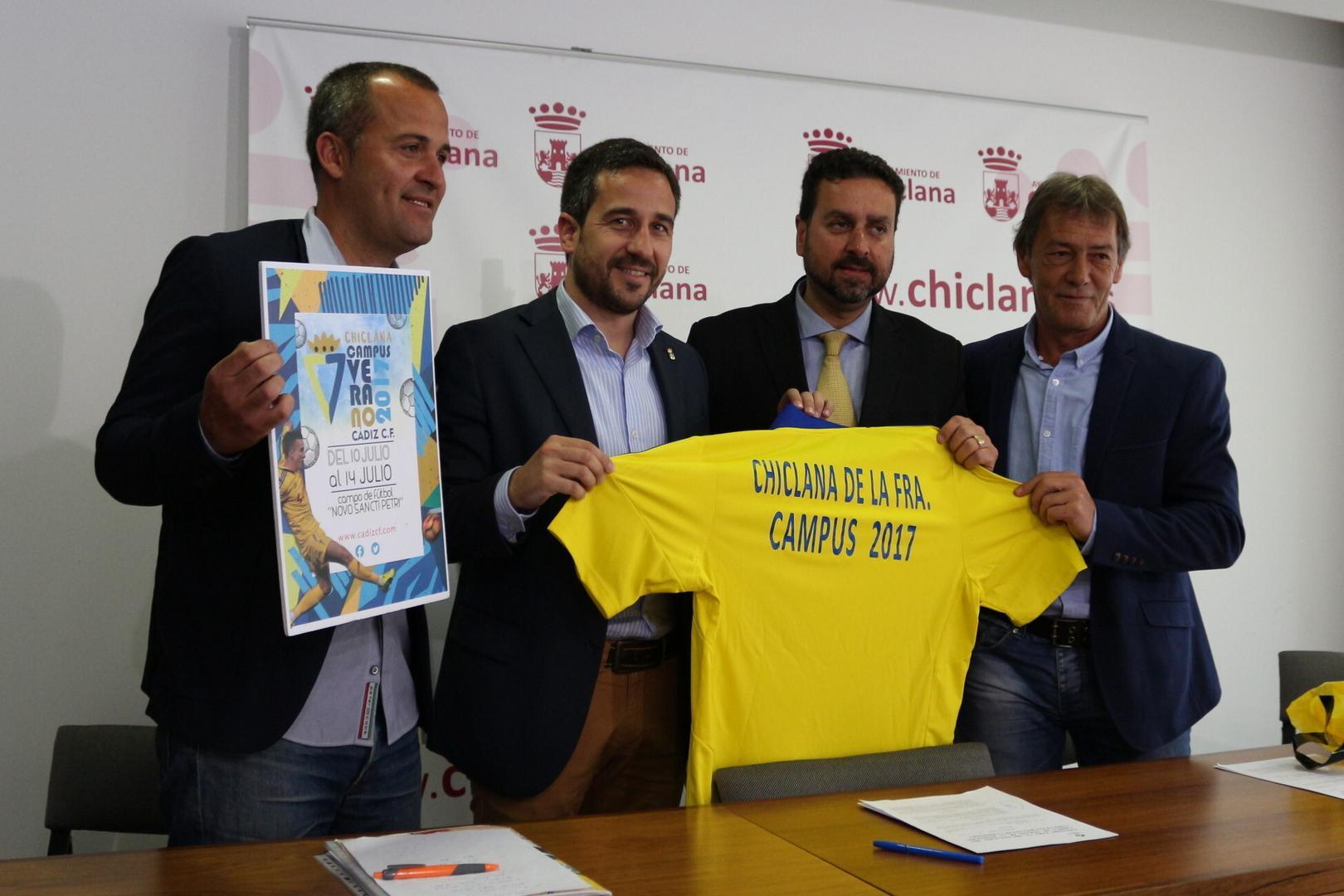El delegado municipal de Deportes, José Manuel Vera, y los representantes del Cádiz CF, Pepe Mejías, Martín José García Marichal y Jesús García ‘Gallo’, han presentado la tercera edición del Campus de verano del Cádiz CF, que se desarrollará en los campos de fútbol de Novo Sancti Petri del 10 al 14 de julio. Esta iniciativa reunirá a unos 160 niños de diferentes puntos de la provincia de nueve de la mañana a dos y media de la tarde, en unas jornadas en las que los niños podrán realizar diversos entrenamientos y actividades, estando también previsto pasar un día en el Pinar Público La Barrosa y otro dedicado al entrenamiento de fútbol playa.