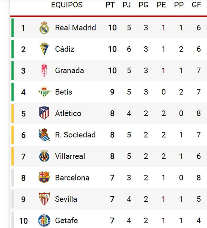Clasificación provisional de LaLiga Santander el sábado 17 de OCTUBRE de 2020