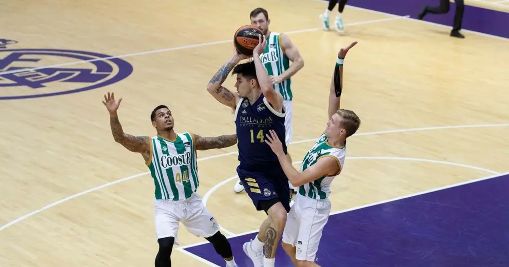 El inicio del segundo cuarto del conjunto blanco fue arrollador. Un parcial 12-3 dejaba muy tocado a los de Curro Segura (30-21). Sin embargo, el Coosur Real Betis se rehízo con un Campbell extraordinario en la dirección de juego. El norteamericano, además, encontró a un Nick Kay también soberbio y acertadísimo en el tiro, tanto por dentro como por fuera. Al descanso se llegó con bastante igualdad y exigua ventaja madridista (39-38).
