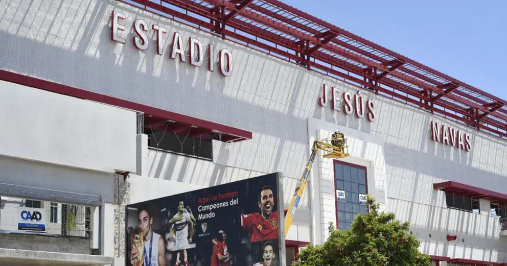 Se trata de la rotulación, que ya luce en la parte central y superior de la fachada. Poco a poco se han ido colocando las diferentes letras hasta completar el nombre del jugador palaciego, canterano y futbolista con más partidos oficiales de la historia sevillista.