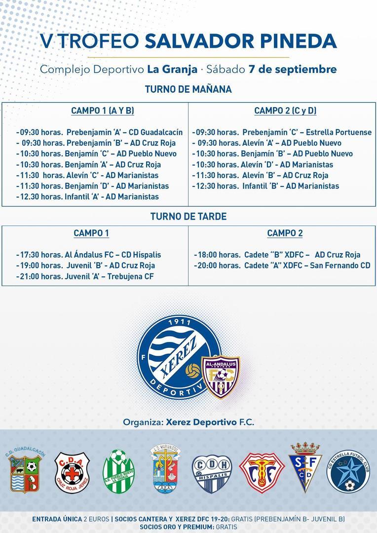 El director de cantera, Juan Carlos Ramírez, junto al directivo Tomás Villena, han dado a conocer esta mañana los detalles de la quinta edición del Trofeo de Cantera Salvador Pineda que se celebrará este sábado en el Complejo Deportivo de la Granja. Por quinta temporada, el Xerez Deportivo FC vuelve a organizar este clásico del verano, homenajeando la figura de Salvador Pineda, cuyo nombre siempre ha estado ligado al fútbol base de la ciudad. En esta ocasión, un total de ocho equipos participarán en una jornada maratoniana que comenzará a las 9:30 horas y que finalizará a las 23:00 horas. Sin duda, una buena oportunidad para disfrutar de la cantera y de todos las jóvenes promesas que tratarán de alzarse con el trofeo en sus respectivas categorías.