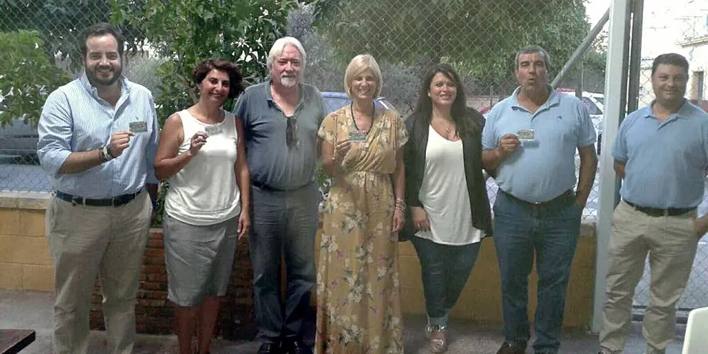 La dirigente popular acompañada de Ricardo Sánchez, Juan Manuel Pérez y de los vocales del PP en Guadalcacín, Cristo Borrego y Ramón Lirio, mantuvieron un encuentro con la directiva del club que la próxima temporada jugará en Primera División.