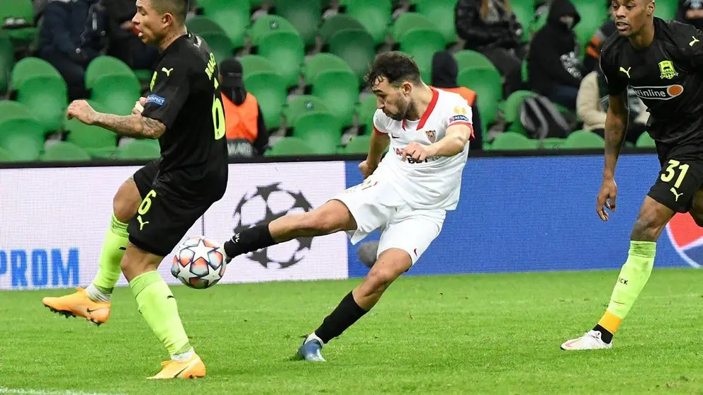 En una de ellas tuvieron los nervionenses una clara opción para ampliar el luminoso, después de una buena galopada de Ocampos en superioridad que asistía a Koundé, pero el disparo tras recorte del francés se quedaba demasiado flojo y sencillo de despejar para el arquero del FC Krasnodar. Munir también lo intentó de zurda desde lejos unos minutos más tarde y Gudelj remataba cerca del palo una falta botada por Óscar. Poco antes del descanso, una pérdida en el centro del campo sevillista propició la internada de Cabella, que no acertó con su lanzamiento y acabó siendo más fácil para Vaclík de lo esperado en el inicio de la jugada.