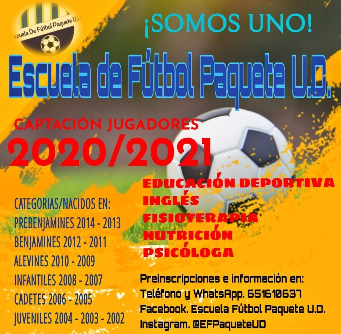 La Escuela de Fútbol Paquete U.D dará comienzo a la temporada 2020-2021 con el lema 'SOMOS UNO'. Es una escuela que lleva 21 años en el Fútbol Base aportando valores y, en definitiva, educación a todos los alumnos que conforman la misma.