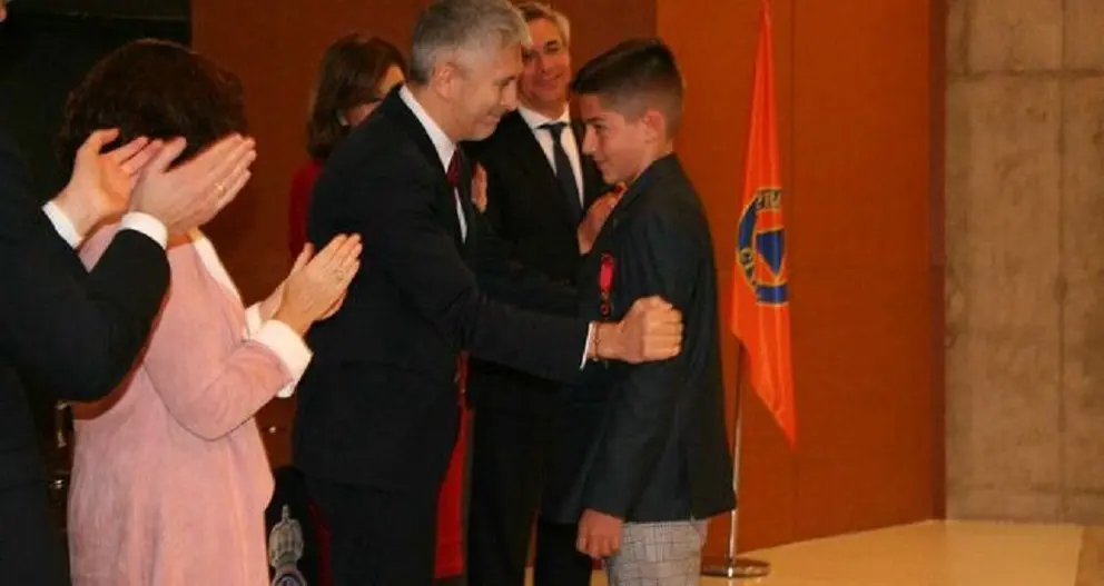 Las firmas de sus ídolos, los jugadores del Real Madrid, se lleva como un tesoro en un balón guardado en una bolsa que el ministro del Interior en funciones, Fernando Grande-Marlaska, le ha entregado al término del acto celebrado en la Escuela Nacional de Protección Civil, en Rivas-Vaciamadrid.