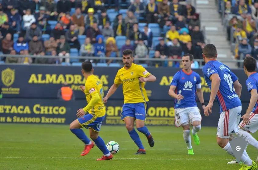Prácticamente en el primer acercamiento cadista pudo llegar el gol. A los cuatro minutos un buen centro de Álex fue cabeceado con efecto por David Barral buscando la escuadra, de donde la sacó Herrero para evitar que el marcador se moviera. El encuentro transcurría con el balón para los amarillos pero sin peligro, lo que hizo que pasado el cuarto de hora Álvaro Cervera optara por cambiar a Salvi y Álvaro García de bandas. No hubo sobresaltos hasta que en el minuto 34 una muy dura entrada de Rocha a Carpio le costó la cartulina roja. El Oviedo se quedaba con uno menos, renunciaba a la línea de cinco defensores, pero logró acercarse en un par de ocasiones al área de Cifuentes. La más clara con una falta directa de Saúl Berjón que Cifuentes salvó con una gran manopla en una buena estirada.