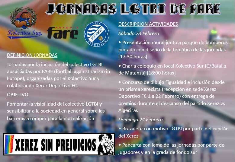 El Xerez Deportivo FC y el Kolectivo Sur organizan durante el fin de semana del 23 y 24 de febrero una nueva edición de las Jornadas LGTBI de FARE. El objetivo es fomentar la visibilidad del colectivo LGTBI y sensibilizar a la sociedad en general sobre las barreras a romper para la normalización.