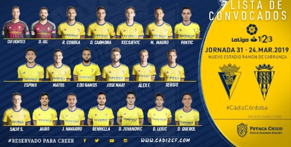 Ayer sábado, día 23 de marzo, se ha celebrado en la ciudad deportiva la última sesión de entrenamientos previa al duelo ante el Córdoba Club de Fútbol. A la conclusión el entrenador Álvaro Cervera ha dado a conocer la siguiente lista de 20 futbolistas convocados para el partido de mañana a las 18:00 horas en el estadio Ramón de Carranza