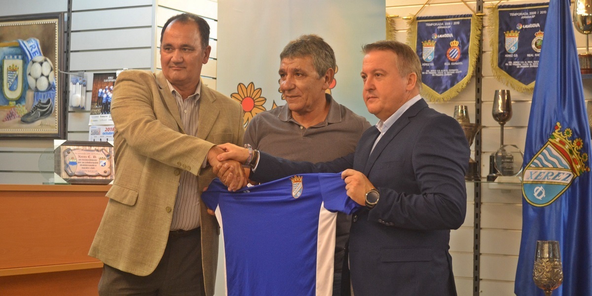 Nene Montero ha sido presentado como nuevo entrenador del Xerez CD en la sede del club, acompañado por Juanmi Becerra y Vicente Vargas como representantes de la entidad.