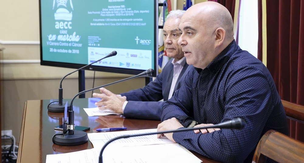 El concejal de Presidencia del Ayuntamiento de Cádiz, David Navarro, y el vicepresidente de la Asociación Española contra el Cáncer en Cádiz, Manuel Jiménez, han presentado la V Carrera contra el Cáncer que se desarrollará en la ciudad el próximo domingo, 28 de octubre.