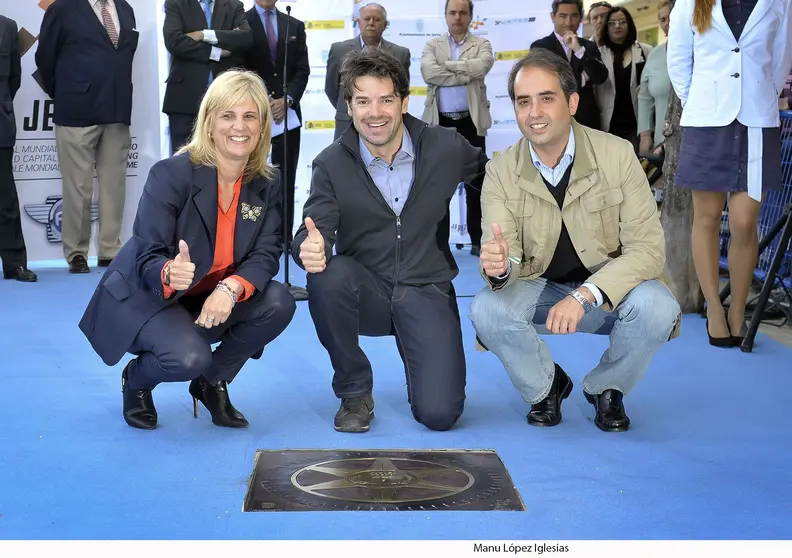 La alcaldesa de Jerez, María José García Pelayo, acompañada por el primer teniente de alcalde y coordinador de Jerez Capital Mundial del Motociclismo, Antonio Saldaña, ha descubierto hoy junto al Campeón del Mundo de Superbike, Carlos Checa, su rueda estrella en el Paseo de la Fama de Jerez.