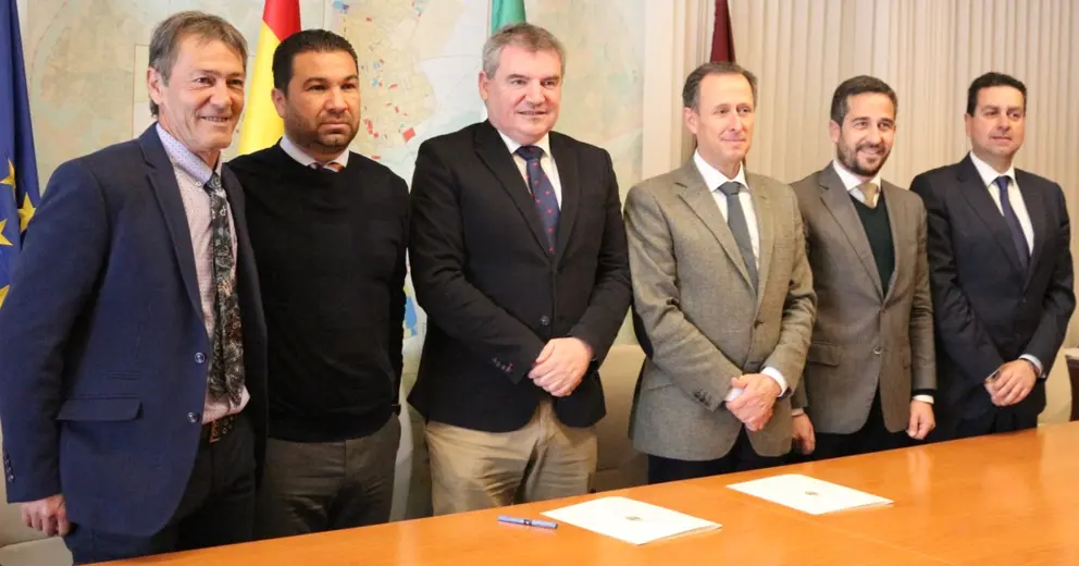 El alcalde de Chiclana, José María Román, y el presidente del Cádiz CF, Manuel Vizcaíno, han firmado un convenio de colaboración entre ambas partes para el uso de instalaciones deportivas en la ciudad y la colaboración con equipos del municipio. Un acto en el que también han estado el delegado municipal de Deportes, José Manuel Vera, y el director deportivo del Cádiz CF, Julio Cordero.