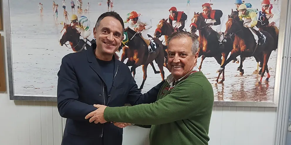 Dionisio González Romero autor del próximo cartel de las Carreras de Caballos de Sanlúcar (izquierda) junto a Rafael Hidalgo, presidente de la Real Sociedad de Carreras de Caballos de Sanlúcar.