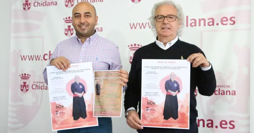 El delegado municipal de Fomento, Adrián Sánchez, y el profesor Alfredo Leché Fernández, Hanshi Kyu 9º Dan Nihon Tai-Jutsu Mochizuki-Ha, han presentado el curso de defensa personal de promoción hacia el colectivo femenino, que se celebrará el próximo 13 de abril, de diez de la mañana a una de la tarde en el Centro de Iniciativas Juveniles Box. Una actividad organizada por el Dojo-Tai-Zen-Do y el Ayuntamiento de Chiclana.
