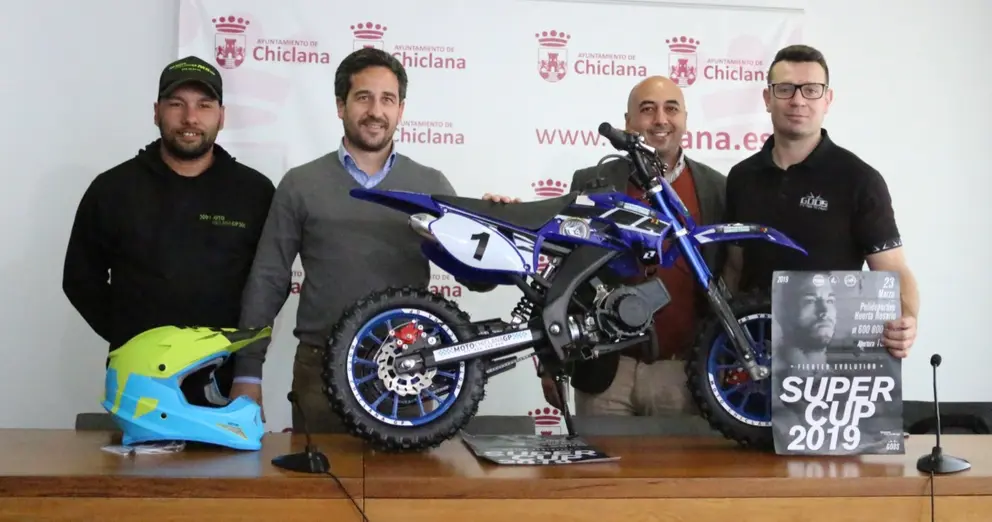 El delegado municipal de Deportes, José Manuel Vera; el delegado municipal de Fomento, Adrián Sánchez; el responsable de la prueba, Román Marcial, y uno de los patrocinadores, David Sánchez, han presentado el Fighter Evolution Super Cup 2019 de muay thai, que se desarrollará este sábado en las instalaciones del pabellón Huerta del Rosario, desde las doce de la mañana, una cita que cuenta con el apoyo de la Federación Andaluza de Kinkboxing y de Muay Thai y de Moto Chiclana GP.