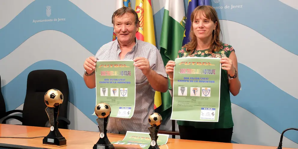 La teniente de alcaldesa de Empleo, Recursos Humanos y Deportes, Laura Álvarez, y el presidente del club de fútbol Federico Mayo, Antonio Pérez Pacheco, han presentado hoy el cartel anunciador del XXXII Trofeo de fútbol ‘Antonio Moure’, que se celebrará mañana sábado, día 19 de agosto, en el campo de la Juventud.