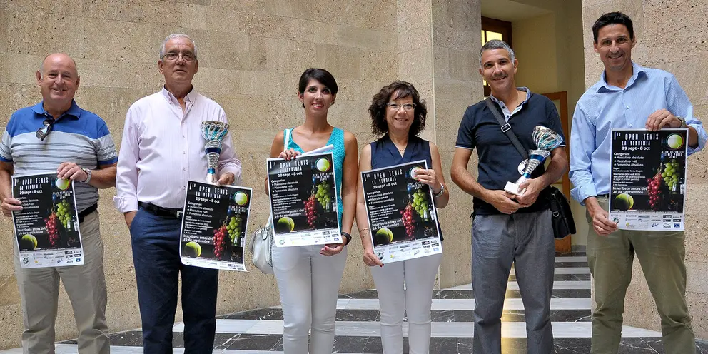 La teniente de alcaldesa de Igualdad, Acción Social y Medio Rural, Carmen Collado, junto a la presidenta del Club Deportivo Tenis y Pádel Jerez, Ana Alejandra Peña; el organizador deportivo del Torneo, Juan Manuel Contreras; el patrocinador del evento y presidente de la Casa de Extremadura, José Antonio Rico, y en representación de los colaboradores, Juan Manuel López-Cepero, de Synergo Events, ha presentado el I Open de Tenis La Vendimia, que tendrá lugar del 29 de septiembre al 8 de octubre en las pistas de Tenis Chapín.