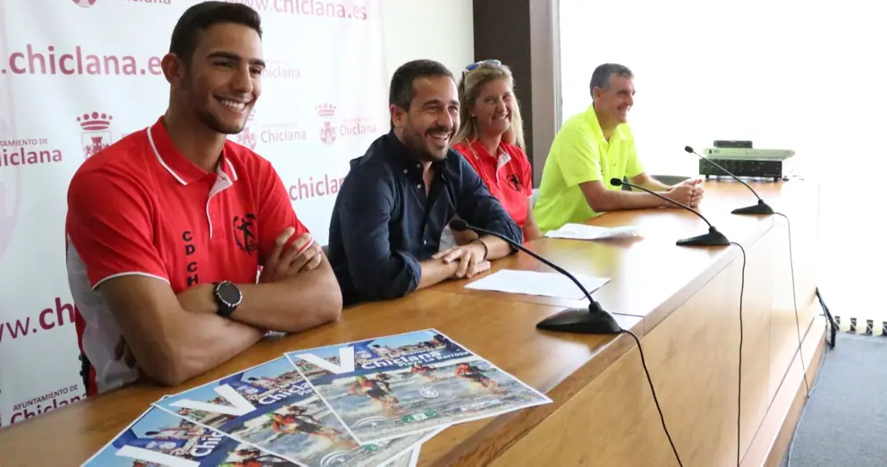 El delegado municipal de Deportes, José Manuel Vera; los representantes del Club Deportivo Chiclanero, Raquel Vázquez y José Manuel Quintero, y el representante del Club Triatlón La Barrosa, Jonathan Macías, han presentado la quinta edición del Triatlón de Menores, que se celebrará el próximo domingo en la playa de La Barrosa, a partir de las nueve y media de la mañana.