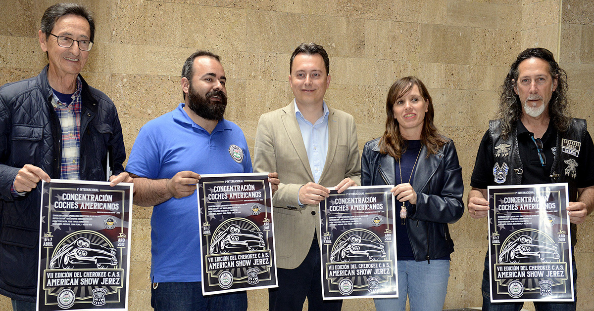 La teniente de alcaldesa de Empleo, Recursos Humanos y Deportes, Laura Álvarez, el teniente de alcaldesa de Economía, Hacienda y Planes Especiales, Santiago Galván, Pepe Hermosín, de la Asociación Motera Custom Cherokee Jerez, Isaac Porquicho de la Asociación de Propietarios de Coches Americanos del Sur (CAS), y Antonio Rosado, presidente de la Federación de Motoclubes Jeresanos, han presentado la I Concentración de Coches Americanos y VII Edición del Cherokee CAS American Show Jerez que tendrá lugar los próximos días 6 y 7 de abril en la pradera de Chapín. Esta actividad se enmarca en la programación elaborada por el Consejo Local del Motor de Jerez.