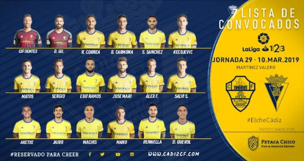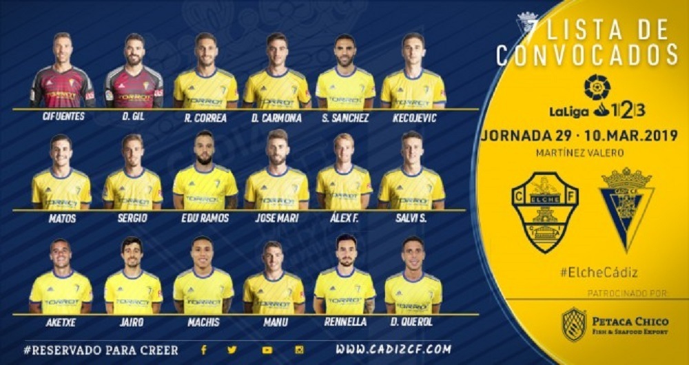 La expedición del Cádiz Club de Fútbol ya ha emprendido viaje a Elche para disputar el encuentro de la jornada 29 en el Martínez Valero este sábado, día 9 de marzo, a las 20:30 horas. La convocatoria está formada por los siguientes 18 futbolistas: