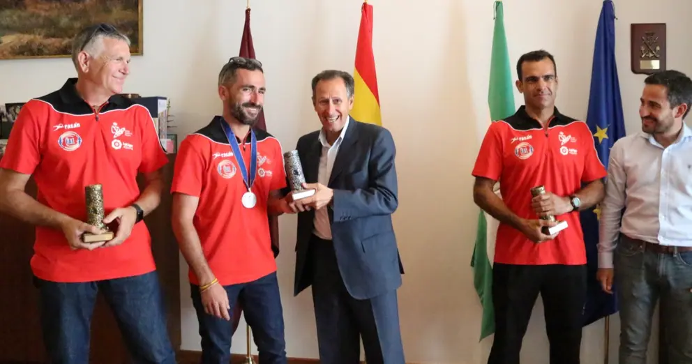 El alcalde de Chiclana, José María Román, ha recibido a los tres chiclaneros que han formado parte de la selección española de paramotor en el Campeonato del Mundo celebrado en Tailandia. Se trata de Vicente Palmero, Javier Sierra y Manuel Bernal, que han conseguido la medalla de bronce por equipos en el mundial. Además, Vicente Palmero se ha proclamado subcampeón del mundo en esta competición.