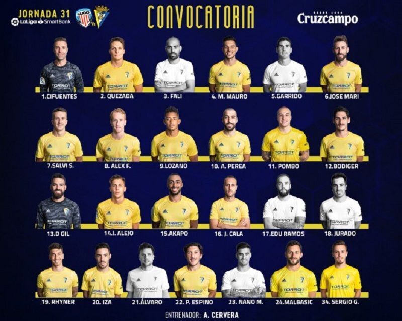 La expedición del Cádiz Club de Fútbol ya se encuentra en Lugo con 19 futbolistas convocados, después de que se haya celebrado la última sesión de entrenamiento. El entrenador Álvaro Cervera no ha podido contar finalmente con Edu Ramos, con problemas físicos, cuya baja se suma a la de Garrido. La lista está conformada por los siguientes jugadores: