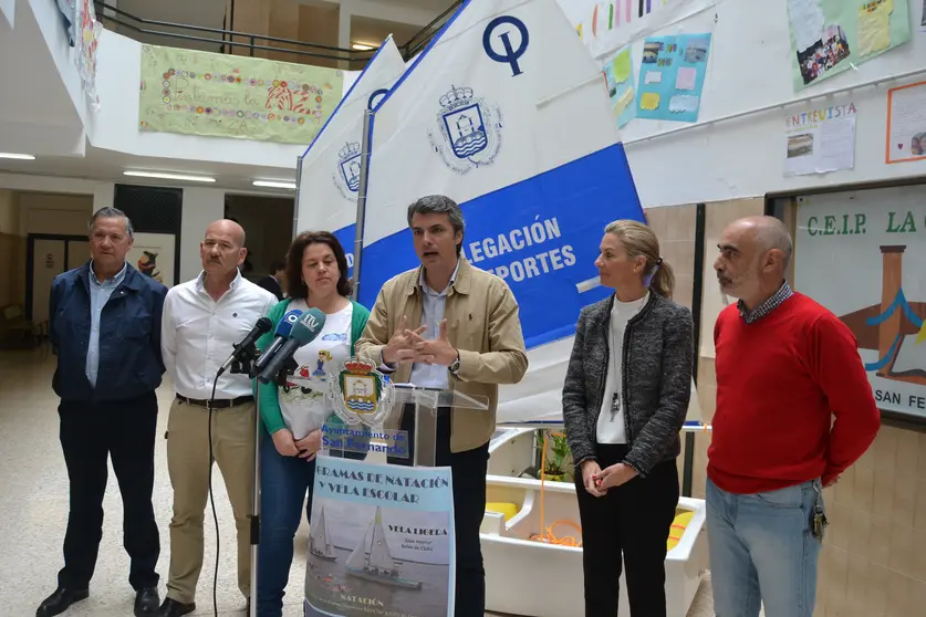 El primer teniente de alcaldesa y delegado general del Área Municipal de Promoción de la Ciudad, Fran Romero; la delegada municipal de Deportes, Maite Lebrero, han presentado esta mañana en el CEIP Constitución el Programa de Vela Escolar del Plan de Apoyo a la Educación Física Escolar. Esta iniciativa está organizada por el Patronato Municipal de Deportes y cuenta con la colaboración de la Escuela de Vela Playa Casería de Ossio y el patrocinio del Centro Comercial Bahía Sur, El Corte Inglés, el Grupo San Marcos y Rótulos Bahía.