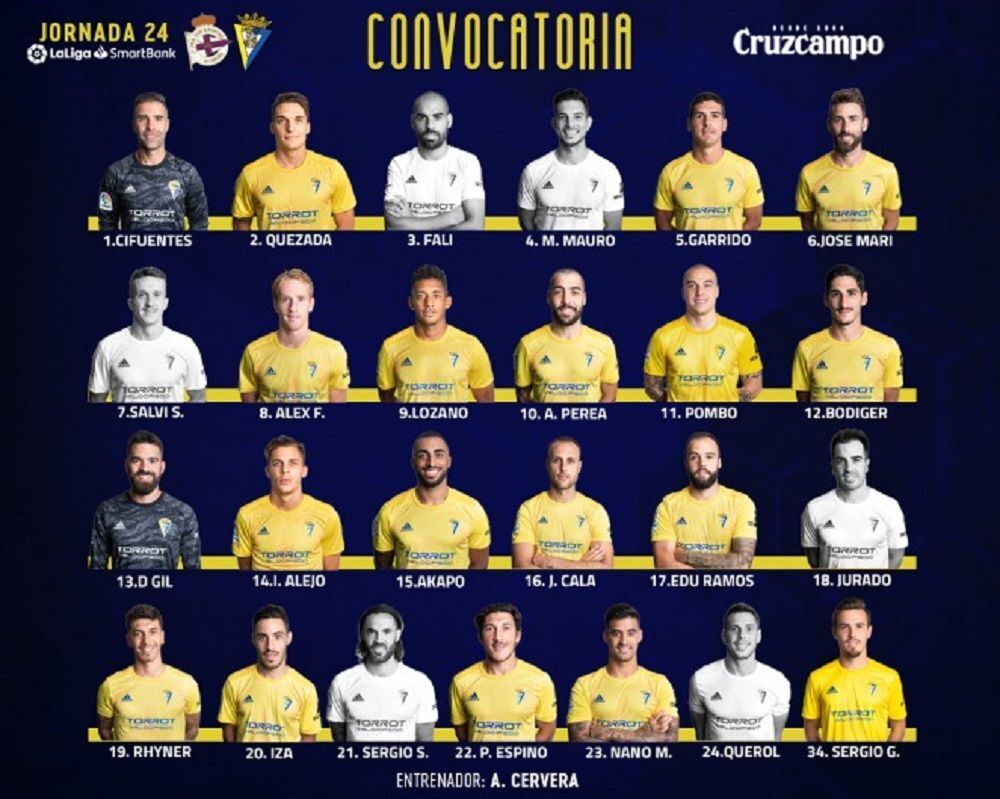 El entrenador Álvaro Cervera ha dado a conocer tras la última sesión de trabajo en la ciudad deportiva la lista de 19 futbolistas convocados para el partido de la jornada 23 en Riazor ante el Deportivo de la Coruña que se disputará este domingo, día 19 de enero, a partir de las 16:00 hroas. La expedición ya se encuentra en tierras gallegas.