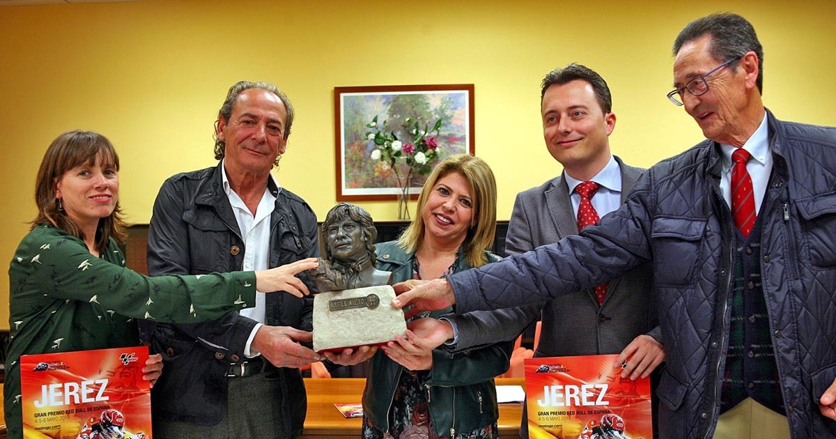 A las 12.30 horas, en la puerta principal de acceso, se descubrirá la obra del escultor Agustín Estudillo que presenta un busto del piloto Ángel Nieto. El busto, a modo de trofeo, también se entregará -en este caso junto con el catavino- a los ganadores de las tres pruebas de Mundial y a los nominados en los Premios del Motor Ciudad de Jerez.