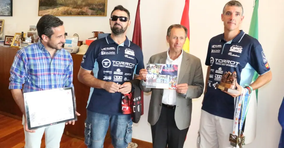 El alcalde de Chiclana, José María Román, acompañado del delegado municipal de Deportes, José Manuel Vera, ha recibido en Alcaldía al paratriatleta chiclanero José Manuel Candón y a su guía Jonathan Macías, campeones en el presente año 2018 de los campeonatos de Andalucía, España y Portugal en la modalidad X-Terra, en la categoría PC Visual Impediment (tándem).