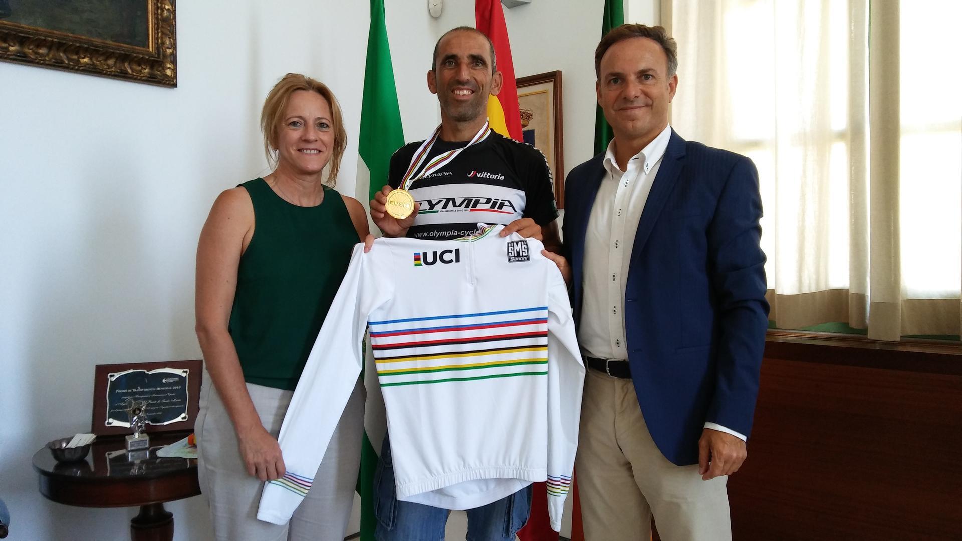 El alcalde de El Puerto David de la Encina y la teniente de alcalde de Deportes Ana Maria Arias han recibido esta mañana en el Ayuntamiento al ciclista portuense Jose Maria Guerrero, que acaba de proclamarse campeón del mundo Máster 30B en Andorra en los Mundiales Másters UCI de BTT 2017.