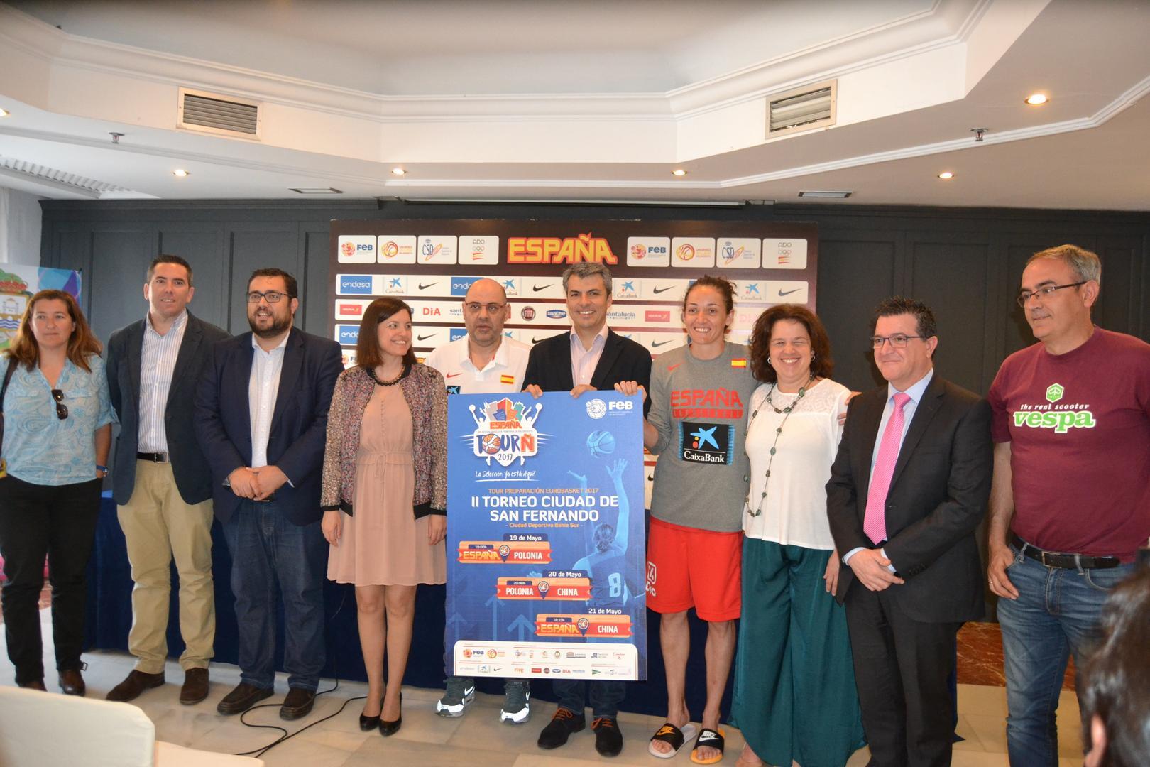 La alcaldesa de la ciudad, Patricia Cavada; el primer teniente de alcaldesa y delegado general del Área Municipal de Promoción de la ciudad, Fran Romero; el diputado provincial de Deportes y concejal de Juventud, Jaime Armario; la delegada municipal de Deportes, Maite Lebreo; el delegado provincial de la Federación Andaluza de Baloncesto, Adolfo Magrañal; el seleccionador de la Selección Absoluta Femenina de Baloncesto de España, Lucas Mondelo; y la capitana de la Selección Absoluta Femenina de Baloncesto de España, Laia Pallau, han presentado esta mañana en el Hotel de Bahía Sur el II Torneo Internacional de Baloncesto Femenino Ciudad de San Fernando.