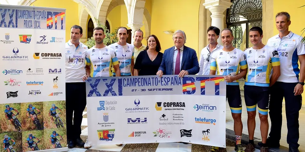 El teniente de alcaldesa de Urbanismo, Dinamización Cultural, Patrimonio y Seguridad, Francisco Camas, ha presentado al equipo de seis agentes de la Asociación Deportiva de la Policía Local de Jerez, Sherrypol, que participará en el XXI Campeonato de España de BTT, del 27 al 30 de septiembre en Ceuta.