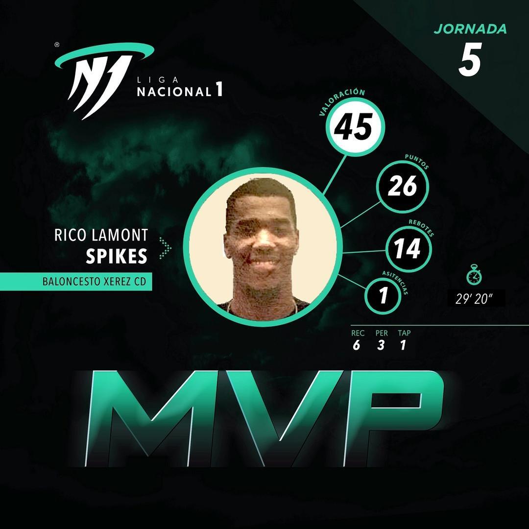 Tan buena actuación realizó el Baloncesto Xerez CD en tierras onubenses que la Federación Andaluza de Baloncesto ha reconocido a Rico Spikes como MVP de la jornada en la categoría de Primera Nacional.