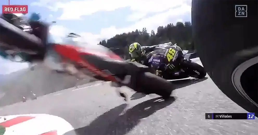 El toque en la octava vuelta entre estos dos pilotos envió a ambos al suelo. Y aún peor, dejó sus motos sin control por el trazado austriaco. Una de las cuales rebotó con mucha potencia y volvió por los aires a la pista justo cuando pasaban Valentino Rossi y Viñales.