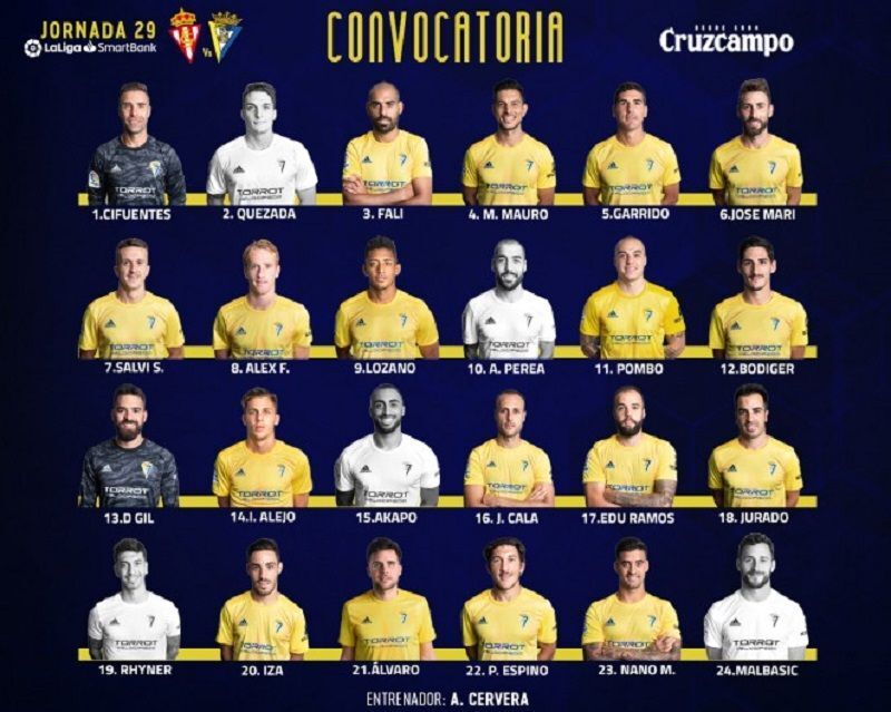 La expedición del Cádiz Club de Fútbol partirá este jueves, día 20 de febrero, rumbo a Gijón, para disputar el encuentro de la jornada 29 ante el Sporting en El Molinón. El entrenador Álvaro Cervera ha dado a conocer la siguiente lista de 19 futbolistas convocados para el desplazamiento: